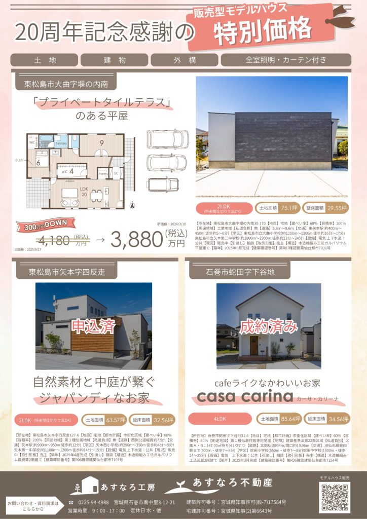 この度東松島市矢本字四反走の販売型モデルハウスがお申し込みを頂きまして、現在販売中のモデルハウスは残り1棟となりました!